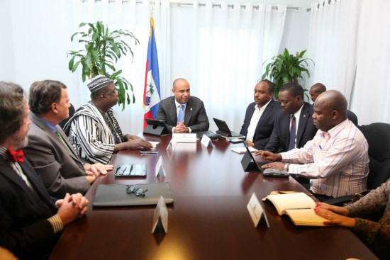 Jeudi, le Premier Ministre Laurent Lamothe, accompagné du Sénateur Wenceslass Lambert, de la Commission sénatoriale des Affaires Etrangères et du Député de Saint Marc, Altesse Toussaint, le nouveau Président du bloc majoritaire présidentiel à la Chambre basse, a reçu une délégation de la Commission de l'Union Inter Parlementaire ainsi que des membres du Secrétariat Parlementaire des Nations-Unis, en visite de travail en Haïti. Cette Commission qui comprend des parlementaires de Finlande, du Mexique, du Canada, de la France et du Burkina Faso s'est déjà rendue dans plusieurs pays d’Asie et d'Afrique, mais c’est la première visite qu’elle effectue dans la région et notamment en Haïti. Présidée par le Député burkinabé, Melegué Traoé, les membres de la délégation a pu s'informer des progrès réalisés en Haïti dans divers domaines, 4 ans après le séisme du 12 Janvier 2010. Certains membres de la délégation, qui visitaient Haïti pour la première fois, n'ont pas caché leur étonnement face aux avancées constatées dans le pays en dépit des faibles ressources d’Haïti. Le Premier Ministre Lamothe, a fait un bilan des réalisations de son Gouvernement pour la mise en place d'un État de Droit basé sur la compréhension et la participation de tous, notamment dans ses relations avec les autres corps de l'État. Il a souligné que la lutte permanente contre la corruption et le blanchiment des avoirs et la modernisation du cadre des affaires, en autres, faisaient partie de plus d'une quarantaine de projets de lois déposées au Parlement. Il en a profité pour réaffirmer la volonté de son Gouvernement, de tenir des élections en 2014.