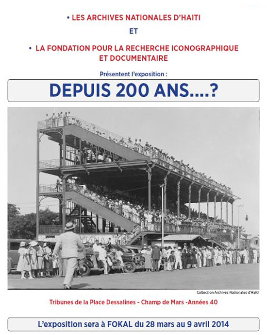 Les Archives Nationales d'Haïti et la Fondation pour la recherche iconographique et documentaire vous invitent à visiter l'exposition « Depuis 200 ans... ? » qui a lieu sous la tonnelle de FOKAL 143 avenue Christophe, Port-au-Prince, du 28 mars au 9 avril 2014 (de 9h00 à 16h00). Une présentation de Patrick Vilaire et de Jacques F. Oriol de la Fondation pour la recherche iconographique et documentaire, qui soulignent que « cette Exposition que nous considérons comme un devoir de mémoire historique, vise à corriger une image négative d'Haïti, rétablir quelques vérités essentielles et surtout réhabiliter, chez l'Homme haïtien ce sentiment de fierté qui habitait les Pères Fondateurs. »