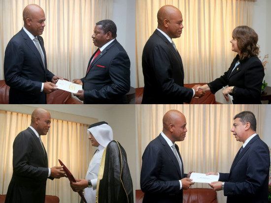 Jeudi au Palais National, le Président Michel Martelly, a reçu les lettres de créance de quatre nouveaux Ambassadeurs accrédités en Haïti. Il s'agit Mme Paula Cadwell (Canada) de Roberto Garcia Marquez (Colombie), de Khamis Al-Sahouti (Qatar) et de Jerobeam Shaanika (Namibie) Ces nouveaux Ambassadeurs ont renouvelé l'engagement de leur pays respectif à accompagner le Président Martelly dans ses efforts visant à améliorer les conditions de vie de la population haïtienne. Pour sa part, le Président de la République les a rassurés de sa volonté de travailler en vue de renforcer les liens d'amitié et de coopération entre Haïti et leur pays.