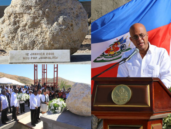Lundi, le Président Michel Martelly, accompagné de son épouse Sophia Martelly, des membres du gouvernement, du corps consulaire et diplomatique, s’est rendu à St-Christophe pour déposer une gerbe de fleurs au pied du monument érigé à la mémoire des victimes du séisme du 12 janvier 2010. Cette cérémonie d'hommage aux victimes, a été ponctuée de moments de recueillement, de chants circonstanciels, de témoignages et de messages de Paix et de solidarité. En cette circonstance émouvante, le Président Martelly a délivré un discours empreint d’émotion. Extrait du Discours du Président Martelly : « [...] Aujourd'hui 12 janvier, pour moi comme beaucoup de mes compatriotes, c'est une journée de tristesse, de deuil, un jour où beaucoup pensent à ce qui s'est passé, à ceux qui sont parti, ceux qui sont devenus handicapés... 35 secondes... et puis la vie de nous tous a changée, le pays a perdu beaucoup, mais en même temps, ce 12 janvier est une journée qui montre une fois de plus, que nous méritons le titre de premier peuple noir sur la Terre. Le 12 janvier nous a secoué, nous a jeté, mais ne nous a pas laissé à terre. Après le 12 janvier, nous nous sommes relevé encore plus droit, pour nous battre avec la vie. Dans les jours qui ont suivi, la solidarité est venue de partout, pour venir nous rejoindre nous les haïtiens qui étions déjà sur le terrain, avec des pinces, piques, ongles, avec nos mains. Nous avons à ce moment là oublier notre personnes, ce que nous avions perdu, pour aider un voisin, un collègue, un inconnu. Chaque vie sauvée était une victoire. Chaque enfant retiré des décombres, était une joie. C'est pour cela que j'ai une pensée spéciale pour tous les professionnels de la santé, beaucoup d'entre-eux étaient victimes, étaient là pour porter secours, tous les pompiers, les policiers qui étaient restés à leur poste malgré tout, tous les volontaires, tous les pays amis, tous les héros que l'histoire ne cite pas, qui ont bravé les dangers pour aider un autre compatriote. On avait pas besoin de savoir où il vivait, dans quel partie politique, combien d'argent il avait... le 12 janvier, il n'y avait pas Lavalas, de macoutes, de sénateurs, de députés, de blancs, de noir, de Pitit Dessalines, de Pitit Pétion, ni de gens d'en haut ou d'en bas, tous les haïtiens étaient victimes et tous les haïtiens s'aidaient les uns les autres, sans discrimination. Il y avait des haïtiens qui aidaient leurs frères et leurs sœurs. Nous étions là, l'un pour l'autre parce que nous étions tous en danger, nous étions un seul peuple... [...] Alors que des scientifiques prévoient qu'il pourrait y avoir d'autres événements de ce type, sinon plus grave qui peuvent nous frapper n'importe quand, posons nous la question : est-ce que nous sommes prêt ? Je pense aujourd'hui que nous pouvons avoir des divergences dans la façon dont nous pensons, dans notre idéologie, mais, il y a une seule chose qui est importante c'est : que faisons-nous ? Nous avons des responsabilités en tant que dirigeant, en tant que citoyen, d’accepter de prendre les décisions qui sont le meilleures pour le pays. Je veux continuer à croire que les haïtiens veulent qu'Haïti avance. Mais souvent, la façon dont ils choisissent de le faire n'aide pas réellement le pays. Lorsqu'une personne brûle des pneus sur la route pour demander des changements, il veut que le pays change. Mais il faut comprendre qu'il n'agit pas dans ce sens [...] car lorsqu'il y a pas de route ou que les routes sont bloquées, c'est le pays qui recule [...] C'est pour ça qu'aujourd'hui, je fais le même geste, je lance de nouveau un appel à tous les haïtiens conséquents, tous les haïtiens croyant dans le changement [...] pour voir comment nous pouvons changer la façon dont nous voulons résoudre les problèmes du pays. [...]
