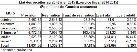 Dans un souci de transparence, la Direction Générale des Impôts (DGI), à partir des informations disponibles indique observer un bon comportement des recettes au premier trimestre de l’exercice 2014-2015, qui a affiché, par rapport aux prévisions, un écart positif de plus de 234.24 millions de Gourdes. Toutefois, la DGI souligne que cette tendance haussière des recettes, s'est ralentie les deux premiers mois de l’année en raison des perturbations (grèves, carnaval...) qui ont affecté la perception des recettes. Tout en précisant que le montant du mois de février est provisoire, en raison de l'indisponibilité de certaines informations sur les recettes perçues par les provinces, les recettes de février se sont élevées 2,237.19 millions de Gourdes, soit un taux de réalisation d'environ 96 %. La DGI indique qu’en date du 28 février 2015, le niveau de collecte (provisoire) est en hausse de 1,726.69 millions de Gourdes, comparé à la même période de l'exercice précédent.