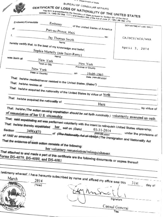 Sophia Martlly n’a pas la double nationalité : Selon Wally Désence, président du BED de l’Ouest 1, tous les 21 cas de contestations de candidats aux législatives partielles ont déjà été traités au niveau du Bureau du Contentieux Électoral Départemental de l’Ouest. Actuellement les juges sont en délibération et devraient communiquer leurs décisions dans les prochaines heures ce jeudi. Par ailleurs concernant la contestation de la candidature de Sophia Martelly de nouveaux documents ont été déposé par les parties, notamment un document officiel de renonciation de la nationalité américaine de la Première Dame devant le bureau des affaires consulaires du Département d’État des Etats-Unis. Un docucument daté du 31 mars 2014, qui prouve hors de tout doute, qu’au moment de son inscription elle n’avait pas la double nationalité, comme allégué par les plaignants.