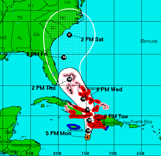 Les départements du Grand Sud, le Sud-Est, le Sud, la Grand'Anse et les Nippes commencent à ressentir plus fortement les effets de l'ouragan de catégorie 4 Matthew, mer agité, fortes vagues, coup de vent, sur le reste du pays des averses, pluies modérées et vents sont constatés. Sachant que le centre de Matthew est à 215 km des côtes sud d’Haïti (Port-Salut) et que les vents de tempête s'étendent jusqu'à 295 km du centre la prudence est de mise dans les régions côtières Sud. Toutefois selon les dernières informations et la trajectoire actuelle, le centre de Matthew va approcher du Sud-Est d'Haïti ce soir, apportant vent et pluie en grande quantité. À l'heure actuelle (7pm) le centre de l'ouragan de catégorie 4 Matthew, est situé à 325 km au Sud-Ouest de Port-au-Prince, 215km au Sud de Port-Salut, 315km au Sud-Ouest de Jacmel. Matthew se déplace vers le Nord Nord-Est à 13km/h (se rapproche donc d'Haïti) un virage vers le Nord à une vitesse plus rapide vers l'avant est prévue plus tard ce soir au mardi soir. Un mouvement vers le nord-nord-ouest est prévu mercredi. Selon la trajectoire prévue, le centre de Matthew abordera le sud-ouest Haïti ce soir, passer près de l'est de Cuba mardi soir (la région Nord-Ouest d'Haïti risque d'être affectée), et se déplacer à proximité ou sur des parties du sud-est et les Bahamas centrales mardi soir et mercredi.