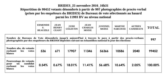 La firme de sondage haïtienne, Bureau de Recherche en Informatique et en Développement Economique et Social (BRIDES), a publié un rapport sur la répartition des votes, en date du 25 novembre 2016, à partir de 997 photographies de procès-verbal (prises par les enquêteurs du BRIDES) de Bureaux de vote sélectionnés au hasard parmi les 11,993 BV au niveau national représentant 99,452 votants dénombrés.