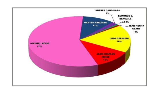 Jovenel Moïse (PHTK) 56.68% (pourcentage de votants pour un candidat excusant les votes blanc) Jude Célestin (LAPEH) 18.01% Marysse Narcisse (Fanmi Lavalas) 10.64% Jean Charles Moïse (Pitit Dessalines) 11.41% Jean Henry Cénat (Renmen Ayiti) 0.67% Edmon Supplice Beauzile (FUSION) 0.54% et autres candidats 2.05% Précisons qu’IL NE S’AGIT PAS DU RÉSULTAT des ÉLECTIONS , BRIDES n’étant pas en mesure de déterminer les PV valides de ceux mis en quarantaine par l’Unité de vérification du Centre de Tabulation des Votes (CTV), ni sur quel candidat cette quarantaine aura une influence. Notez que selon les dernières informations disponibles au CTV, 2/3 des 22% de procès-verbaux soumis à vérification, ont été mis en quarantaine, les autres ont été réintroduit dans le système. Donc une information a prendre avec les réserves d'usage.