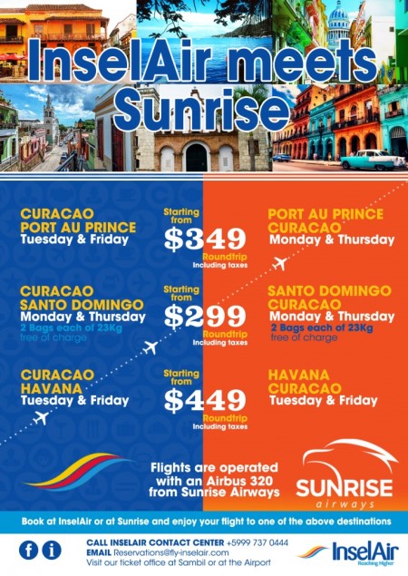 La compagnie aérienne haïtienne Sunrise Airways et Inselair, basées en Haïti, vont débuter une coopération sur leurs routes mutuelles. Sunrise Airways, une compagnie aérienne en pleine croissance https://www.haitilibre.com/article-24704-haiti-flash-sunrise-airways-un-success-story-haitien.html qui exploite des vols au départ de Port au Prince en Haïti vers Curaçao, Cuba (La Havane, Santiago de Cuba et Camaguey) et Santo-Domingo. Ces vols sont opérés sur Airbus A320 avec des cabines économiques et de classe affaires. De plus, Sunrise exploite des vols intérieurs entre Port-au-Prince et le Cap-Haïtien. La coopération sera mise en œuvre en deux phases. Au cours de la première phase, à compter d'aujourd'hui, les deux compagnies aériennes vendront aussi des billets sur les vols de l’autre compagnie. La deuxième phase, dans environ deux mois débutera lorsque les systèmes de réservation des compagnies aériennes seront fusionnés. À partir de ce moment là, les passagers n'auront besoin que d'un seul billet pour voyager dans les destinations desservies par ces deux compagnies aériennes. Les billets pour les destinations Sunrise peuvent être achetés aux guichets InselAir.