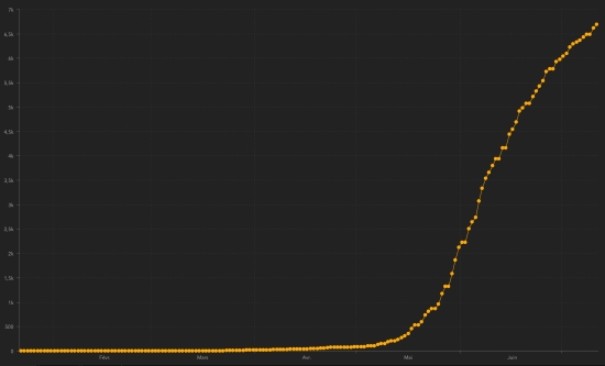 *Note : Les autorités haïtiennes de la santé ayant « omis » 10 fois de mettre à jour le nombre de cas… ce graphique est en conséquence une représentation plus positive que la réalité. Cas confirmés par département : Ouest : 4,972 cas (+25), la veille : (+45) Artibonite : 356 cas (inchangé), la veille : (+9) Centre : 300 cas (+1) Nord : 250 cas (inchangé), la veille : (+2) Sud : 181 cas (+2), la veille : (+6) Sud-Est : 175 cas (+7), la veille : (+4) Nord-Ouest : 149 cas (+2), la veille : (+7) Grand’Anse : 133 cas (inchangé) Nord-Est : 110 cas (inchangé) Nippes : 101 cas (inchangé) Localisation des cas : Ouest : 4,972 cas (+25) Delmas : 1,229 cas (+2), la veille : (+15) Port-au-Prince : 1,045 cas (+1), la veille : (+8) Pétion-ville : 757 cas (+2), la veille : (+2) Tabarre : 612 cas (+2), la veille : (+5) Croix-des-Bouquets : 461 cas (+3), la veille : (+1) Carrefour : 369 cas (+1), la veille : (+2) Petit-Goâve : 108 cas (+2), la veille : (+1) Cité Soleil : 85 cas (inchangé), la veille : (+1) Cabaret : 60 cas (inchangé), la veille : (+3) Léogâne : 58 cas (+7) Kenskoff : 55 cas (+1) Gressier 35 cas(+1), la veille : (+2) Archaie : 34 cas (inchangé), la veille : (+1) Anse à Galet : 29 cas (inchangé), la veille : (+2) Ganthier : 9 cas (inchangé) Grand Goâve : 9 cas (+3), la veille : (+1) Cornillon : 8 cas (inchangé) Thomazeau : 5 cas (inchangé), la veille : (+1) Fonds-Verettes : 4 (inchangé) Artibonite : 356 cas (inchangé) Saint Marc : 129 cas (inchan©é), la veille : (+3) Gonaïves : 82 cas (inchangé) Verettes : 81 cas (inchangé), la veille : (+5) Gros Morne : 13 cas (inchangé) Petite Rivière de l’Artibonite : 11 cas (inchangé) L’Estère : 9 cas (inchangé) Marchand Dessalines : 11 cas (+1), la veille : (+1) Desdunes : 5 cas (inchangé) Saint Michel : 5 cas (inchangé) Ennery : 3 cas (inchangé) La Chappelle : 2 cas (inchangé) Grande Saline : 2 cas (inchangé) Anse Rouge : 2 cas (inchangé) Marmelade : 1 cas (inchangé) Centre : 300 cas (+1) Mirebalais : 129 cas (inchangé) Hinche : 94 cas (inchangé) Boucan Carré : 27 cas (inchangé) Lascaobas : 20 cas (+1) Belladère : 12 cas (inchangé) Thomonde : 4 cas (inchangé) Savanette : 4 cas (inchangé) Saut-d’Eau 4 cas (inchangé) Cerca la Source : 3 cas (inchangé) Maissade : 2 cas (inchangé) Cerca Cavajal : 1 cas (inchangé) Nord : 250 cas (inchangé) Cap Haïtien : 157 cas (inchangé), la veille : (+1) Limbé : 18 cas (inchangé) Milot : 12 cas (inchangé) Pignon : 11 cas (inchangé) Grande Rivière du Nord : 10 cas (inchangé) Plaine du Nord : 10 cas (inchangé) Plaisance du Nord : 6 cas (inchangé) Borgne : 6 cas (inchangé) Limonade : 6 cas (inchangé) Quartier Morin : 5 cas (inchangé) Acul du Nord : 4 cas (inchangé) Dondon : 2 cas (inchangé) Pilate : 1 cas (inchangé) Port Margot : 1 cas (inchangé) Bahon : 1 cas (inchangé) Sud : 181 cas (+2) Cayes : 105 cas (inchangé), la veille : (+1) Aquin : 19 cas (inchangé) Saint-Louis du Sud : 9 cas (+2) Les Anglais : 8 cas (+3), la veille : (+3) Port-Salut : 7 cas (inchangé) Torbeck : 6 cas (inchangé), la veille : (+1) Camp-Perrin : 5 cas (inchangé) Chardonnières : 5 cas (inchangé) Tiburon : 4 cas (inchangé) Port à Piment : 4 cas (inchangé) Coteaux : 2 cas (inchangé) Chantal : 2 cas (inchangé) St Jean du Sud : 2 cas (inchangé) Cavaillon 1 cas (inchangé) Île-à Vache : 1 cas (inchangé) Roche à Bateau : 1 cas (inchan©é), la veille : (+1) Sud-Est : 175 cas (+7) Jacmel : 138 cas (+6), la veille : (+3) Bainet : 9 cas (inchangé) Côte-de-Fer : 7 cas (inchangé) Vallée de Jacmel : 8 cas (+1), Thiotte : 4 cas (inchangé) Marigot : 3 cas (inchangé) Belle Anse : 3 cas (+1), la veille : (+1) Anse-à-Pitre : 2 cas (inchangé) Cayes Jacmel : 1 cas (inchangé) Nord-Ouest : 149 cas (+2) Port de Paix : 92 cas (inchangé) Bombardopolis : 13 cas (inchangé), la veille : (+1) Saint-louis du Nord : 13 cas (+1) Jean Rabel : 10 cas (inchangé), la veille : (+1) Môle Saint-Nicolas : 11 cas (inchangé), la veille : (+3) Chansolme : 4 cas (inchangé), la veille : (+1) La Tortue : 3 cas (inchangé), la veille : (+1) Anse-à-Foleur : 1 cas (inchangé) Baie de Henne 1 cas (inchangé), la veille : (+1) Bassin Bleu : 1 cas (+1) Grand'Anse : 133 cas (inchangé) Jérémie : 104 cas (inchangé), Anse d’Hainault : 14 (inchangé) Chambellan : 7 cas (inchangé) Pestel : 2 cas (inchangé) Irois : 2 cas (inchangé) Bonbon : 1 cas (inchangé) Dame Marie : 1 cas (inchangé) Moron : 1 cas (inchangé) Roseaux : 1 cas (inchangé) Nord-Est : 110 cas (inchangé) Ouanaminthe : 33 cas (inchangé) Caracol 27 cas (inchangé) Fort Liberté : 20 cas (inchangé) Trou du Nord : 18 cas (inchangé) Terrier Rouge : 7 cas (inchangé) Mont Organisé : 2 cas (inchangé) Mombon Crochu 1 cas (inchangé) Ferrier : 1 cas (inchangé) Carice 1 cas (inchangé) Nippes : 101 cas (inchangé) Miragoâne : 46 cas (inchangé) Fond des Nègres : 17 cas (inchangé) Baradères : 8 cas (inchangé) Petite Riviere de Nippes : 6 cas (inchangé) Petit Trou de Nippes : 5 cas (inchangé) Plaisance du Sud : 5 cas (inchangé) Anse à Veau 5 cas (inchangé) L’Asile : 5 cas (inchangé) Paillant : 2 cas (inchangé) Arnaud : 1 cas (inchangé) Grand Boucan : 1 cas (inchangé) NOTE : « inchangé » signifie qu’il n’y a pas de nouvelles données disponibles : il peut s’agir d’absence de nouveaux cas, de cas non rapportés ou incomplets ou de retard dans la transmission des données au Ministère ce qui est le cause la plus fréquente. Répartition des cas par tranche d’âge : 0-9 ans : 178 (+1) 10-19 ans : 214 (+6) 20-29 ans : 1,246 (+16) 30-39 ans : 2,020 (+6) 40-49 ans : 1,252 (+3) 50-59 ans : 826 (+3) 60-69 ans : 609 (+2) 70 ans et plus : 382 (inchangé) Répartition des décès par tranche d’âge : 0-9 ans : 5 décès (inchangé) 10-19 ans : 2 décès (inchangé) 20-29 ans : 8 décès (inchangé)) 30-39 ans : 10 décès (inchangé) 40-49 ans : 18 décès (inchangé), 50-59 ans : 29 décès (in