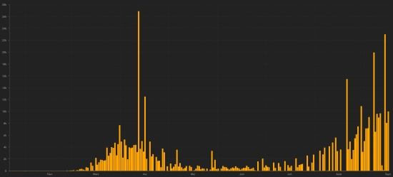 SITUATION MONDIALE : Jeudi 17 septembre 2020, le nombre de personnes contaminées dans le monde par le coronavirus Covid-19 depuis le début de la pandémie (Source officielle), s’élève à 29,893,298 (+285,708), la veillle (+300,659). Nombre de pays contaminés 188 (inchangé). Bulletin de la veille : https://www.haitilibre.com/article-31816-haiti-diaspora-covid-19-bulletin-quotidien-16-septembre-2020.html Depuis le début de la pandémie 20,335,410 personnes (+234,805 en 24h) ont été guéries du Covid-19 dans le monde, la veille (+218,937) Depuis le début de la pandémie 941,345 personnes sont mortes du Covid-19 dans le monde (+5,474 en 24h), la veille (+6,845) Le nombre de cas actifs dans le monde (excluant les décès et les guérisons) est actuellement de 8,616,543 cas (+45,429 en 24h), la veille (+74,877) Monde : Nombre de cas confirmés quotidiens