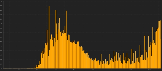 Taux moyen de guérison au monde : 69.65% (+) Taux moyen de mortalité au monde : 2.95% (-) TOP 5 des pays ayant le plus de cas actifs : (moins décès et guérisons) 1er - USA : 4,297,304 cas (+21,076 en 24h), la veille (+24,894) 2e - Inde : 934,427 cas (-3,198 en 24h), la veille (-7,371) 3e - Espagne : 607,470 (données non disponible depuis 48h), précédent (+11,212) 4e - France : 522,666 (+12,389 en 24h), La veille (+16,477) 5e - Royaume Unis 460,776 (entre de nouveau dans le TOP 5) TOP 5 des pays ayant le plus de décès : 1er - USA : 209,734 décès (+340 en 24h), la veille (+671) 2e - Brésil :146,352 décès (+365 en 48h), la veille (+599) 3e - Inde : 102,785 décès (+903 en 24h), la veille (+940) 4e - Mexico : 79,088 décès (+208 en 24h), la veille (+388) 5e - Royaume-Unis 42,440 décès (+33 en 24h), la veille (+49) TOP 5 des pays ayant le plus grand nombre total de guérisons : 1er - Inde : 5,586,703 guérisons (+76.737 en 24h), taux de guérison 84.34% (+) 2e - Brésil : 4,375,354 guérisons (+14,246 en 24h), taux de guérison 89.02% (+) 3e - USA : 2,911,699 personnes (+14,377 en 24h), taux de guérison 39,25% (+) 4e - Russie : 978,610 guérisons (+3,122 en 24h), taux de guérison 80.23% (-) 5e - Colombie : 761,674 guérisons (+3,873 en 24h), taux de guérison 89,08% (-) DIASPORA : USA : Cas depuis le début de l’épidémie : 7,418,737 cas (+35,793 en 24h), la veille (+49,518) Guérisons : 2,911,699 personnes (+14,377 en 24h), la veille (+23,953) Taux national de Guérison : 39.25% (+) Décès : 209,734 décès (+340 en 24h), la veille (+671) Cas actifs (moins décès et guérisons) : 4,297,304 cas (+21,076 en 24h), la veille (+24,894) Canada : Cas depuis le début de l’épidémie : 168,501 cas (+2,141 en 24h ), la veille (+1,306) Guérisons : 142,502 personnes (+1,791 en 24h), la veille (+894) Taux national de Guérison : 84,57% (-) Décès : 9,533 décès (+45 en 24h), la veille (+22) Taux national de mortalité : 5.66% (-) Cas actifs : (excluant décès et guérisons) 16,466 cas (+305 en 24h), la veille (+390) Canada : Nombre de cas confirmés quotidiens