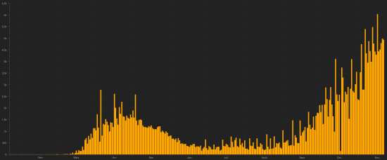 Toujours en phase plateau, baisse du nombre de cas et des décès ces dernière 24h Taux moyen de guérison au monde : 64.04% (-) Taux moyen de mortalité au monde : 2.37% (-) TOP 5 des pays ayant le plus de cas actifs : (moins décès et guérisons) 1er - USA : 7,303,840 cas (+102,249 en 24h), la veille (+146,902) 2e - France : 1,979,734 (+14,834 en 24h), la veille (+19,931) 3e - Espagne : 1,363,735 (actualisation non disponible), la veille (14,828) 4e - Royaume Unis 1,439,104 (+19,519 en 24h), la veille (+19,751) 5e - Inde : 440,962 cas (-1,215 en 24h), la veille (+491) TOP 5 des pays ayant le plus de décès : 1er - USA : 255,900 décès (+1,476 en 24h), la veille (+1,869) 2e - Brésil : 168,989 décès (+376 en 24h), la veille (+552) 3e - Inde : 133,227 décès (+501 en 24h, la veille (+564) 4e - Mexico : 100,823 décès (actualisation non disponible), la veille (+719) 5e - Royaume-Unis 54,721 (+340 en 24h), la veille (+511) TOP 5 des pays ayant le plus grand nombre total de guérisons : 1er - Inde : 8,521,617 guérisons (+43,493 en 24h), taux de guérison 93.69% (+) 2e - Brésil : 5,437,189 guérisons (+6,293 en 24h), taux de guérison 89.83% (-) 3e - USA : 4,529,700 personnes (+71,770 en 24h), taux de guérison 37.10% (-) 4e - Russie : 1,582,768 guérisons (+17,871 en 24h), taux de guérison 76.39% (+) 5e - Argentine : 1,187,053 guérisons (+9,234 en 24h), taux de guérison 86,89% (+) DIASPORA : USA : Cas depuis le premier cas (9 mars 2020) : 12,089,440 cas (+175,495 en 24h), la veille (+195,992) Guérisons : 4,529,700 personnes (+71,770 en 24h), la veille (+47,221) Taux national de Guérison : 37.10% (-) Décès : 255,900 décès (+1,476 en 24h), la veille (+1,869) Cas actifs (moins décès et guérisons) : 7,303,840 cas (+102,249 en 24h), la veille (+146,902) Canada : Cas depuis le début de l’épidémie : 329,084 cas (+4,932 en 24h), la veille (+4,977) Guérisons : 265,568 personnes (+3,814), précédent (+4,444) Taux national de Guérison : 80.70% (+) Décès : 11,455 décès (+70 en 24h), la veille (+71) Taux national de mortalité : 3,48% (-) Cas actifs : (excluant décès et guérisons) 52,061 cas (+1.048 en 24h), la veille (+462) Canada : Nombre de cas confirmés quotidiens