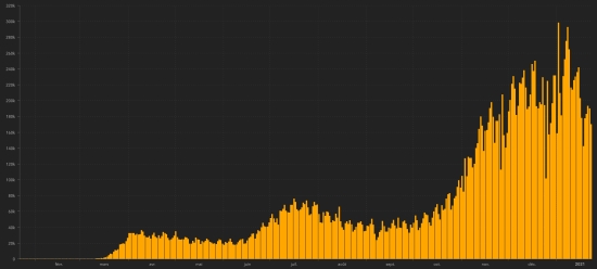SITUATION MONDIALE : Dimanche 24 janvier 2021, le nombre de personnes contaminées dans le monde par le coronavirus Covid-19 depuis le début de la pandémie (Source officielle), s’élève à 98,817,191 cas (+568.483), la veille (+656,571). Nombre de pays contaminés 192. Bulletin de la veille : https://www.haitilibre.com/article-32845-haiti-diaspora-covid-19-bulletin-quotidien-309.html Depuis le début de la pandémie 54,508,976 personnes ont été guéries du Covid-19 dans le monde (+334,642), la veille (+351,353) Depuis le début de la pandémie 2,122,010 personnes sont mortes du Covid-19 dans le monde (+13,602 en 24h), la veille (+15,377) Le nombre de cas actifs (moins décès et guérisons) dans le monde est actuellement de 42,186,205 (+220,209 en 24h), la veille (+289,841) Taux moyen de guérison au monde : 55.16% (-) Taux moyen de mortalité au monde : 2,15% (=) Monde : Nombre de cas confirmés quotidiens :
