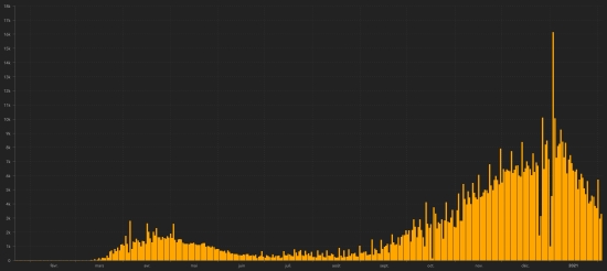 SITUATION MONDIALE : Jeudi 4 février 2021, le nombre de personnes contaminées dans le monde par le coronavirus Covid-19 depuis le début de la pandémie (Source officielle), s’élève à 104,438,604 cas (+495,239), la veille (+419,837). Nombre de pays contaminés 192 (inchangé). Bulletin de la veille : https://www.haitilibre.com/article-32932-haiti-diaspora-covid-19-bulletin-quotidien-320.html Depuis le début de la pandémie 58,060,212 personnes ont été guéries du Covid-19 dans le monde (+328,805), la veille (+260,951) Depuis le début de la pandémie 2,269,947 personnes sont mortes du Covid-19 dans le monde (+15,640 en 24h), la veille (+12,898) Le nombre de cas actifs (moins décès et guérisons) dans le monde est actuellement de 44,108,445 (+150,794 en 24h), la veille (+145,988) Taux moyen de guérison au monde : 55.59% (+) Taux moyen de mortalité au monde : 2,17% (=) Monde : Nombre de cas confirmés quotidiens :
