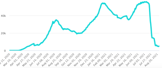 Vaccination : 5,18 millards de doses de vaccin injectées (+50 millions de doses injectées en 24h mis à jour 27 août 2021 dernières données disponibles). HAÏTI : Situation épidémiologique : Si l’on en croit le Ministère de la Santé Publique, +5 nouveaux cas en 24h de Covid-19 et de ses variants auraient été confirmés en Haïti le 21 août 2021 (dernières données partielles disponibles) pour un total de 20,850 cas confirmés sur l’ensemble du territoire national (46.2% de femmes et 53.8% hommes), depuis le premier cas (19 mars 2020 https://www.haitilibre.com/article-30319-haiti-sante-origine-des-2-premiers-cas-de-covid-19-en-haiti.html ). Précédente mise à jour (+12 cas le 20 août). 3ème vague : Le total de la 3ème vague (début 10 mai 2021) s’élève à 7,544 cas confirmés et 313 décès.. Mise à jour 21 août 2021. Guérisons : 17,669 (+106 en 24h) Taux de guérison : 84,74% (+) Décès : 584 décès +0 () Taux de mortalité : 2,80% (=) Haïti : Tendance des décès :