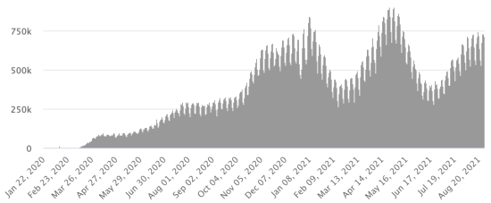 SITUATION MONDIALE : Situation épidémiologique : Samedi 28 août 2021 le nombre de personnes contaminées dans le monde par le coronavirus Covid-19 depuis le début de la pandémie (Source officielle), s’élève à 216,254,492 cas (+710,886 en 24h), la veille (+747,218) Nombre de pays contaminés : 192 *Guérisons : 193,240,488 personnes ont été guéries du Covid-19 dans le monde (+521,289 en 24h), la veille (+599.266) *Décès : 4,499,553 personnes sont mortes du Covid-19 dans le monde (+9,592 en 24h), la veille (+12,466) *Cas actifs (moins décès et guérisons) dans le monde est actuellement de 18,514,451 cas (+180,005 en 24h), la veille (+135,486) Taux moyen de guérison au monde : 89,35% (-) Taux moyen de mortalité au monde : 2,08% (=) Monde : Nombre de cas confirmés quotidiens :