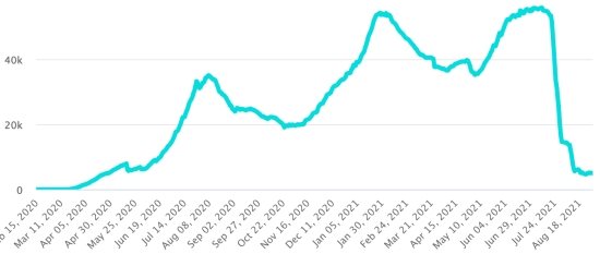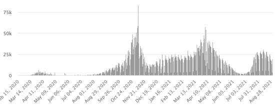 Vaccination : 5,33 milliards de doses de vaccin injectées (+40 millions de doses injectées en 24h mis à jour 31 août 2021 dernières données disponibles). HAÏTI : Situation épidémiologique : Avertissement : Le Ministère de la Santé Publique et de la Population (MSPP) n’as pas rendu disponible après le 24 août 2021, les données quotidiennes sur la situation du Covid-19 en Haïti. En conséquence, les données ci-dessous sur la situation en Haïti sont les dernières disponibles. Si l’on en croit le Ministère de la Santé Publique, +20 nouveaux cas en 24h de Covid-19 et de ses variants auraient été confirmés en Haïti le 24 août 2021 (dernières données partielles disponibles) pour un total de 20,916 cas confirmés sur l’ensemble du territoire national (46.2% de femmes et 53.8% hommes), depuis le premier cas (19 mars 2020 https://www.haitilibre.com/article-30319-haiti-sante-origine-des-2-premiers-cas-de-covid-19-en-haiti.html ). Précédente mise à jour (+46 cas les 22 et 23 août). 3ème vague : Le total de la 3ème vague (début 10 mai 2021) s’élève à 7,610 cas confirmés et 315 décès.. Mise à jour 24août 2021. Guérisons : 18,040 (+114 en 24h) Taux de guérison : 86,24% (+) Décès : 586 décès +0 () Taux de mortalité : 2,80% (=) Haïti : Tendance des décès :