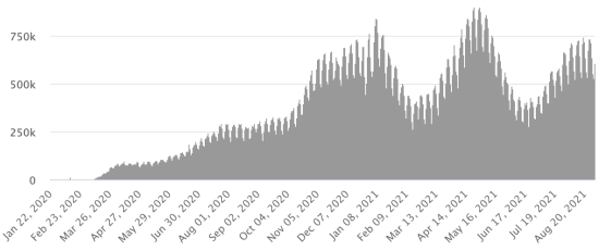 SITUATION MONDIALE : Situation épidémiologique : Mercredi 1er septembre 2021 le nombre de personnes contaminées dans le monde par le coronavirus Covid-19 depuis le début de la pandémie (Source officielle), s’élève à 218,600,962 cas (+647,810 en 24h), la veille (+667,233) Nombre de pays contaminés : 192 *Guérisons : 195,446,632 personnes ont été guéries du Covid-19 dans le monde (+612,019 en 24h), la veille (+650,419) *Décès : 4,534,291 personnes sont mortes du Covid-19 dans le monde (+9,934 en 24h), la veille (+8,091) *Cas actifs (moins décès et guérisons) dans le monde est actuellement de 18,620,039 cas (+25,857 en 24h), la veille (+8,723) Taux moyen de guérison au monde : 89,40% (+) Taux moyen de mortalité au monde : 2,07% (=) Monde : Nombre de cas confirmés quotidiens :