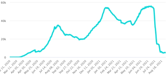 Vaccination : 5,38 millards de doses de vaccin injectées (+50 millions de doses injectées en 24h. Mise à jour 1er septembre 2021 (dernières données disponibles). HAÏTI : Situation épidémiologique : Si l’on en croit le Ministère de la Santé Publique, +25 nouveaux cas en 48h de Covid-19 et de ses variants auraient été confirmés en Haïti les 25 et 26 août 2021 (dernières données partielles disponibles) pour un total de 20,941 cas confirmés sur l’ensemble du territoire national (46.2% de femmes et 53.8% hommes), depuis le premier cas (19 mars 2020 https://www.haitilibre.com/article-30319-haiti-sante-origine-des-2-premiers-cas-de-covid-19-en-haiti.html ). Précédente mise à jour (+20 cas le 24 août). 3ème vague : Le total de la 3ème vague (début 10 mai 2021) s’élève à 7,635 cas confirmés et 315 décès.. Mise à jour 26 août 2021. Guérisons : 18,222 (+182 en 48h) Taux de guérison : 87,01% (+) Décès : 586 décès +0 () Taux de mortalité : 2,79% (-) Haïti : Tendance des décès :