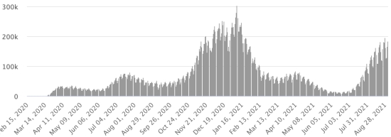 SITUATION MONDIALE : Situation épidémiologique : Jeudi 2 septembre 2021 le nombre de personnes contaminées dans le monde par le coronavirus Covid-19 depuis le début de la pandémie (Source officielle), s’élève à 219,353,018 cas (+752,056 en 24h), la veille (+647,810) Nombre de pays contaminés : 192 *Guérisons : 196,164,669 personnes ont été guéries du Covid-19 dans le monde (+718,037 en 24h), la veille (+612,019) *Décès : 4,546,687 personnes sont mortes du Covid-19 dans le monde (+12,396 en 24h), la veille (+9,934) *Cas actifs (moins décès et guérisons) dans le monde est actuellement de 18,641,662 cas (+21,623 en 24h), la veille (+25,857) Taux moyen de guérison au monde : 89,42% (+) Taux moyen de mortalité au monde : 2,07% (=) Monde : Nombre de cas confirmés quotidiens :