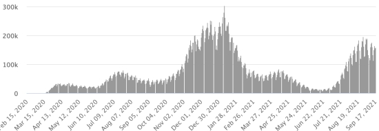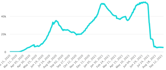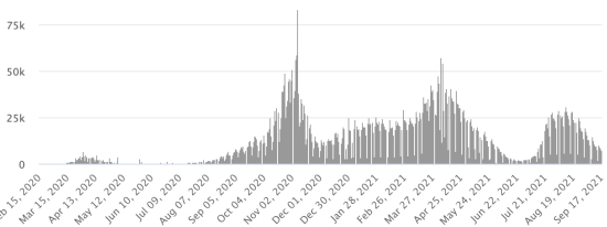 Nippes : 149 (2020 : 149) Décès cumulés par département (2021) : Ouest : 196 (2020 : 104) Nord : 32 (2020 : 34) Centre : 26 (2020 : 13) Artibonite : 21 (2020 : 39) Nord-Est : 5 (2020 : 6) Sud : 32 (2020 : 6) Sud-Est : 11 (2020 : 9) Nord-Ouest : 11 (2020 : 12) Grand'Anse : 5 (2020 : 13) Nippes : 17 (2020 : 5) Répartition des décès par âge (depuis le début de l’épidémie) : 0-9 ans : 13 10-19 ans : 6 20-29 ans : 22 30-39 ans : 37 40-49 ans : 62 50-59 ans : 102 60-69 ans : 130 70-79 ans : 135 (+1) 80 ans et plus : 90 Vaccination : 52,050 (+1,767 en 4 jours) doses de vaccin « Spikevax » (appellation officielle) du Laboratoire MODERNA ont été injectés au total depuis le 16 juillet 2021, date de la première injection. 15,002 personnes sont entièrement vaccinées (2 doses). Mise à jour 13 septembre août 2021, dernières données disponibles. Liste des 68 Centres de vaccination ouverts en Haïti (et horaires) par département : (mise à jour 13 septembre 2021) DIASPORA : Situation épidémiologique : USA : *Cas depuis le premier cas (9 mars 2020) : 42,799,907 cas (+165,853 en 24h), la veille (+154,274) *Guérisons : 32,434,166 guérisons (+86,440 en 24h), la veille (+76,642) Taux national de Guérison : 75,78% (-) *Décès : 690,714 décès (+2,228 en 24h), la veille (+3,463) Taux national de mortalité : 1,61% (=) *Cas actifs (moins décès et guérisons) : 9,675,027 cas (+77,185 en 24h), la veille (+74,169) *Tests : 617,825,327 personnes testées depuis le premier cas USA : Nombre de cas confirmés quotidiens :