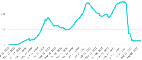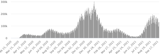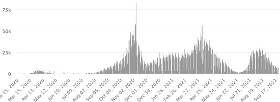 3ème vague : Le total de la 3ème vague (début 10 mai 2021) s’élève à 8,152 cas confirmés et 336 décès.. Mise à jour 16 septembre 2021. Cas testés depuis le début de la pandémie : 117,020 cas (+297 en 24h) mise à jour 17 septembre 2021 dernières données disponibles. Notez que le très faible nombre de personnes testées ne permet pas statistiquement de faire une estimation représentative des cas actifs de Covid-19 en Haïti. Ce qui eplique également le faible nombre de cas détecté quotidiennement. À titre de comparaison la République voisine a réalisé plus de 2,000,000 tests sur sa population depuis le début de l’épidémie. Communes les plus touchées dans l’Ouest (2021) : Delmas : 2,004 (+6) ; Pétion ville 1,720 (+0) ; Port-au-Prince 1,098 (+2) ; Tabarre 858 (+1) ; Croix-des-Bouquets 876 (+5) Cas confirmés par département (2021) : Ouest : 7,633 (2020 : 6,945) Nord : 489 (2020 : 677) Centre : 690 (2020 : 508) Artibonite : 577 (2020 : 593) Nord-Est : 292 (2020 : 314) Sud-Est : 357 (2020 : 274) Sud : 499 (2020 : 262) Nord-Ouest : 264 (2020 : 229) Grand'Anse : 408 (2020 : 176) Nippes : 150 (2020 : 149) Décès cumulés par département (2021) : Ouest : 200 (2020 : 104) Nord : 34 (2020 : 34) Centre : 26 (2020 : 13) Artibonite : 22 (2020 : 39) Nord-Est : 5 (2020 : 6) Sud : 34 (2020 : 6) Sud-Est : 11 (2020 : 9) Nord-Ouest : 12 (2020 : 12) Grand'Anse : 5 (2020 : 13) Nippes : 17 (2020 : 5) Répartition des décès par âge (depuis le début de l’épidémie) : 0-9 ans : 13 10-19 ans : 6 20-29 ans : 22 30-39 ans : 37 40-49 ans : 64 50-59 ans : 104 60-69 ans : 135 70-79 ans : 135 80 ans et plus : 90 Vaccination : 61,204 (+861 en 3 jours) doses de vaccin « Spikevax » (appellation officielle) du Laboratoire MODERNA ont été injectés au total en Haïti depuis le 16 juillet 2021, date de la première injection. 18,535 personnes sont entièrement vaccinées (2 doses). Mise à jour 21 septembre août 2021, dernières données disponibles. Liste des 75 Centres de vaccination ouverts en Haïti (et horaires) par département : (mise à jour 20 septembre 2021) DIASPORA : Situation épidémiologique : USA : *Cas depuis le premier cas (9 mars 2020) : 43,404,877 cas (+162,575 en 24h), la veille (+134,674) *Guérisons : 32,947,854 guérisons (+117,829 en 24h), la veille (+154,043) Taux national de Guérison : 75,90% (-) *Décès : 699,748 décès (+2,881 en 24h), la veille (+2,248) Taux national de mortalité : 1,61% (=) *Cas actifs (moins décès et guérisons) : 9,757,275 cas (+41,865 en 24h), la veille (-21,617) *Tests : 627,053,632 personnes testées depuis le premier cas USA : Nombre de cas confirmés quotidiens :