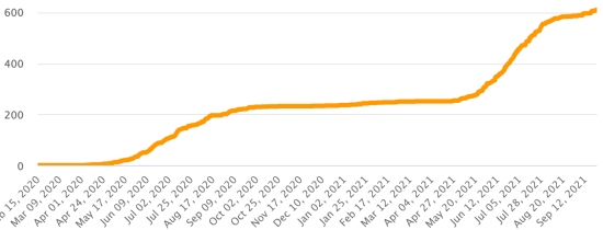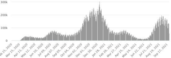 Vaccination : 6,11 millards de doses de vaccin injectées (+10 millions de doses injectées en 24h. Mise à jour 25 septembre 2021 (dernières données disponibles). HAÏTI : Situation épidémiologique : Avertissement : Le Ministère de la Santé Publique et de la Population (MSPP) n’as pas rendu disponible après le 19 septembre 2021 les données quotidiennes sur la situation du Covid-19 en Haïti. En conséquence, les données ci-dessous sur la situation en Haïti sont les dernières disponibles. Si l’on en croit le Ministère de la Santé Publique, +54 nouveaux cas en 48h de Covid-19 et de ses variants auraient été confirmés en Haïti les 18 et 19 septembre 2021 (dernières données partielles disponibles) pour un total de 21,540 cas confirmés sur l’ensemble du territoire national (46.3% de femmes et 53.7% hommes), depuis le premier cas (19 mars 2020 https://www.haitilibre.com/article-30319-haiti-sante-origine-des-2-premiers-cas-de-covid-19-en-haiti.html ). Précédente mise à jour (+33 cas le 17 septembre). Guérisons : 19,348 (+64 en 48h) Taux de guérison : 89,82% (+) Décès : 610 décès +3 en 24h (Ouest +3) Taux de mortalité : 2,83% (+) Haïti : Tendance des décès :