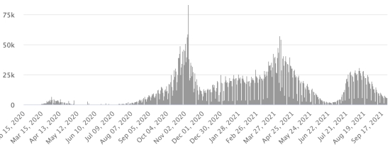 3ème vague : Le total de la 3ème vague (début 10 mai 2021) s’élève à 8,206 cas confirmés et 339 décès.. Mise à jour 19 septembre 2021. Cas testés depuis le début de la pandémie : 117,578 cas (+558 en 48h) mise à jour 19 septembre 2021 dernières données disponibles. Notez que le très faible nombre de personnes testées ne permet pas statistiquement de faire une estimation représentative des cas actifs de Covid-19 en Haïti. Ce qui eplique également le faible nombre de cas détecté quotidiennement. À titre de comparaison la République voisine a réalisé plus de 2,000,000 tests sur sa population depuis le début de l’épidémie. Communes les plus touchées dans l’Ouest (2021) : Delmas : 2,015 (+11) ; Pétion ville 1,722 (+2) ; Port-au-Prince 1,099 (+1) ; Tabarre 864 (+6) ; Croix-des-Bouquets 882 (+6) Cas confirmés par département (2021) : Ouest : 7,666 (2020 : 6,945) Nord : 489 (2020 : 677) Centre : 697 (2020 : 508) Artibonite : 582 (2020 : 593) Nord-Est : 293 (2020 : 314) Sud-Est : 360 (2020 : 274) Sud : 500 (2020 : 262) Nord-Ouest : 265 (2020 : 229) Grand'Anse : 410 (2020 : 176) Nippes : 151 (2020 : 149) Décès cumulés par département (2021) : Ouest : 203 (2020 : 104) Nord : 34 (2020 : 34) Centre : 26 (2020 : 13) Artibonite : 22 (2020 : 39) Nord-Est : 5 (2020 : 6) Sud : 34 (2020 : 6) Sud-Est : 11 (2020 : 9) Nord-Ouest : 12 (2020 : 12) Grand'Anse : 5 (2020 : 13) Nippes : 17 (2020 : 5) Répartition des décès par âge (depuis le début de l’épidémie) : 0-9 ans : 13 10-19 ans : 6 20-29 ans : 22 30-39 ans : 37 40-49 ans : 65 (+1) 50-59 ans : 104 60-69 ans : 136 (+1) 70-79 ans : 136 (+1) 80 ans et plus : 90 Vaccination : 61,204 (+861 en 3 jours) doses de vaccin « Spikevax » (appellation officielle) du Laboratoire MODERNA ont été injectés au total en Haïti depuis le 16 juillet 2021, date de la première injection. 18,535 personnes sont entièrement vaccinées (2 doses). Mise à jour 21 septembre août 2021, dernières données disponibles. Liste des 75 Centres de vaccination ouverts en Haïti (et horaires) par département : (mise à jour 20 septembre 2021) DIASPORA : Situation épidémiologique : USA : *Cas depuis le premier cas (9 mars 2020) : 43,725,604 cas (+56,924 en 24h), la veille (+136,374) *Guérisons : 33,162,044 guérisons (+49,051 en 24h), la veille (+79,468) Taux national de Guérison : 75,84% (+) *Décès : 706,058 décès (+765 en 24h), la veille (+2,315) Taux national de mortalité : 1,61% (=) *Cas actifs (moins décès et guérisons) : 9,857,502 cas (+7,108), la veille (+54,591) *Tests : 631,838,920 personnes testées depuis le premier cas USA : Nombre de cas confirmés quotidiens :