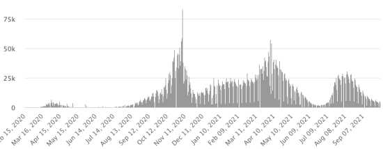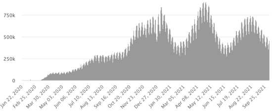 Vaccination : 398,68 millions de doses de vaccin injectées depuis le 14 décembre 2020 date de la première injection aux États-Unis (960,000 doses injectées, en 24h). Mise à jour 6 octobre 2021 (dernières données disponibles).