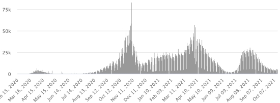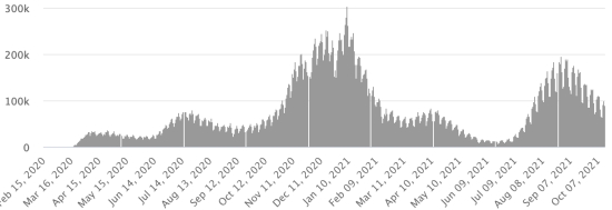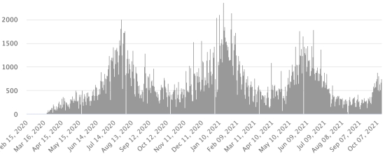 Cas testés depuis le début de la pandémie : 125,430 cas (+348 en 24h) mise à jour 8 octobre 2021 dernières données disponibles. Notez que le très faible nombre de personnes testées ne permet pas statistiquement de faire une estimation représentative des cas actifs de Covid-19 en Haïti. Ce qui explique également le faible nombre de cas détecté quotidiennement. À titre de comparaison la République voisine a réalisé plus de 2,1millions de tests sur sa population depuis le début de l’épidémie. TOP 5 des Communes les plus touchées dans l’Ouest (2021) : Delmas : 2,176(+16) ; Pétion ville 1,776 (+4) ; Port-au-Prince 1,189 (+12) ; Croix-des-Bouquets 964 (+10) ; Tabarre 946 (+7). Cas confirmés par département (2021) : Ouest : 8,222 cas (2020 : 6,945 cas) Nord : 552 cas (2020 : 677 cas) Centre : 757 cas (2020 : 508 cas) Artibonite : 640 cas (2020 : 593 cas) Nord-Est : 310 cas (2020 : 314 cas) Sud-Est : 467 cas (2020 : 274 cas) Sud : 634 cas (2020 : 262 cas) Nord-Ouest : 300 cas (2020 : 229 cas) Grand'Anse : 624 cas (2020 : 176 cas) Nippes : 194 cas (2020 : 149 cas) Décès cumulés par département (2021) : Ouest : 212 décès (2020 : 104 décès) Nord : 43 décès (2020 : 34 décès) Centre : 31 décès (2020 : 13 décès) Artibonite : 25 décès (2020 : 39 décès) Nord-Est : 8 décès (2020 : 6 décès) Sud : 37 décès (2020 : 6 décès) Sud-Est : 11 décès (2020 : 9 décès) Nord-Ouest : 12 décès (2020 : 12 décès) Grand'Anse : 5 décès (2020 : 13 décès) Nippes : 22 décès (2020 : 5 décès) Répartition des décès par âge (depuis le début de l’épidémie) : 0-9 ans : 13 décès 10-19 ans : 6 décès 20-29 ans : 25 décès 30-39 ans : 40 décès 40-49 ans : 67 décès 50-59 ans : 108 décès 60-69 ans : 147 décès 70-79 ans : 142 décès 80 ans et plus : 101 décès Vaccination : 95,732 (+7,940 en 3 jours) doses de vaccin « Spikevax » (appellation officielle) du Laboratoire MODERNA ont été injectées au total en Haïti depuis le 16 juillet 2021, date de la première injection. 26,694 personnes sont entièrement vaccinées (2 doses). Mise à jour 10 octobre 2021, dernières données disponibles. Liste des 128 Centres de vaccination ouverts en Haïti (et horaires) par département : (mise à jour 11 octobre 2021) DIASPORA : Situation épidémiologique : USA : *Cas depuis le premier cas (9 mars 2020) : 45,639,012 cas (+91,092 en 24h), la veille (+116,753) *Guérisons : 35,205,258 guérisons (+97,806 en 24h), la veille (+109,484) Taux national de Guérison : 77,13% (+) *Décès : 741,893 décès (+2,115 en 24h), la veille (+2,189) Taux national de mortalité : 1,62% (=) *Cas actifs (moins décès et guérisons) : 9,691,861 cas (-8,829), la veille (-5,080) *Tests : 665,881,444 personnes testées depuis le premier cas USA : Nombre de cas confirmés quotidiens :