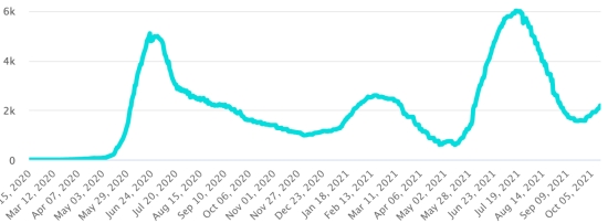 Vaccination : 6,61 millards de doses de vaccin injectées (+10 millions de doses injectées en 24h. Mise à jour 14 octobre 2021 (dernières données disponibles). HAÏTI : Situation épidémiologique : Selon le Ministère de la Santé Publique, +96 nouveaux cas en 24h de Covid-19 et de ses variants auraient été confirmés en Haïti le 8 octobre 2021 (dernières données partielles disponibles) pour un total de 22,827 cas confirmés sur l’ensemble du territoire national (46.5% de femmes et 53.5% hommes), depuis le premier cas (19 mars 2020 https://www.haitilibre.com/article-30319-haiti-sante-origine-des-2-premiers-cas-de-covid-19-en-haiti.html ). Précédente mise à jour (+56 cas le 7 octobre). Guérisons : 19,989 (+0 en 24h) Taux de guérison : 87,56% (-) Décès : 649 décès +0 en 24h () Taux de mortalité : 2,84% (-) Haïti : Tendance des décès :