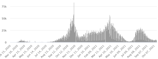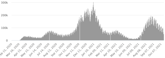 4ème vague : Le total de la 3ème vague (début 20 septembre 2021) s’élève à 1,459 cas confirmés (+109) et 47 décès (+0). Mise à jour 11 octobre 2021. Cas testés depuis le début de la pandémie : 126,473 cas (+701 en 24h) mise à jour 11 octobre 2021 dernières données disponibles. Notez que le très faible nombre de personnes testées ne permet pas statistiquement de faire une estimation représentative des cas actifs de Covid-19 en Haïti. Ce qui explique également le faible nombre de cas détecté quotidiennement. À titre de comparaison la République voisine a réalisé plus de 2,1millions de tests sur sa population depuis le début de l’épidémie. TOP 5 des Communes les plus touchées dans l’Ouest (2021) : Delmas : 2,218 (+17) ; Pétion ville 1,794 (+11) ; Port-au-Prince 1,215 (+12) ; Croix-des-Bouquets 976 (+2) ; Tabarre 962 (+6). Cas confirmés par département (2021) : Ouest : 8,346 cas (2020 : 6,945 cas) Nord : 558 cas (2020 : 677 cas) Centre : 770 cas (2020 : 508 cas) Artibonite : 643 cas (2020 : 593 cas) Nord-Est : 322 cas (2020 : 314 cas) Sud-Est : 475 cas (2020 : 274 cas) Sud : 643 cas (2020 : 262 cas) Nord-Ouest : 310 cas (2020 : 229 cas) Grand'Anse : 651 cas (2020 : 176 cas) Nippes : 197 cas (2020 : 149 cas) Décès cumulés par département (2021) : Ouest : 214 décès (2020 : 104 décès) Nord : 43 décès (2020 : 34 décès) Centre : 34 décès (2020 : 13 décès) Artibonite : 25 décès (2020 : 39 décès) Nord-Est : 8 décès (2020 : 6 décès) Sud : 37 décès (2020 : 6 décès) Sud-Est : 11 décès (2020 : 9 décès) Nord-Ouest : 12 décès (2020 : 12 décès) Grand'Anse : 7 décès (2020 : 13 décès) Nippes : 23 décès (2020 : 5 décès) Répartition des décès par âge (depuis le début de l’épidémie) : 0-9 ans : 13 décès 10-19 ans : 6 décès 20-29 ans : 25 décès 30-39 ans : 42 décès 40-49 ans : 68 décès 50-59 ans : 109 décès 60-69 ans : 149 décès 70-79 ans : 144 décès (+1) 80 ans et plus : 101 décès Vaccination : 95,732 (+7,940 en 3 jours) doses de vaccin « Spikevax » (appellation officielle) du Laboratoire MODERNA ont été injectées au total en Haïti depuis le 16 juillet 2021, date de la première injection. 26,694 personnes sont entièrement vaccinées (2 doses). Mise à jour 10 octobre 2021, dernières données disponibles. Liste des 128 Centres de vaccination ouverts en Haïti (et horaires) par département : (mise à jour 11 octobre 2021) DIASPORA : Situation épidémiologique : USA : *Cas depuis le premier cas (9 mars 2020) : 45,908,212 cas (+11,568 en 24h), la veille (+18,357) *Guérisons : 35,573,510 guérisons (+198,915 en 24h), la veille (+22,252) Taux national de Guérison : 77,48% (+) *Décès : 746,509 décès (+1,963 en 24h), la veille (+161) Taux national de mortalité : 1,62% (=) *Cas actifs (moins décès et guérisons) : 9,588,193 cas (-85,198), la veille (-4,056) *Tests : 672,533,278 personnes testées depuis le premier cas USA : Nombre de cas confirmés quotidiens :