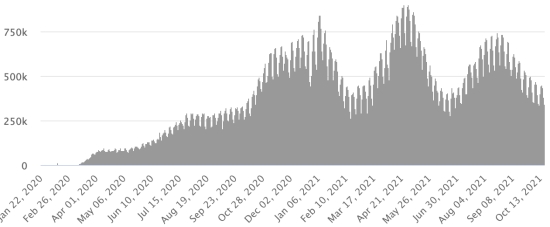 SITUATION MONDIALE : Situation épidémiologique : Mardi 19 octobre 2021 le nombre de personnes contaminées dans le monde par le coronavirus Covid-19 depuis le début de la pandémie (Source officielle), s’élève à 241,933,023 cas (+428,985 en 24h), la veille (+295,600) Nombre de pays contaminés : 221 *Guérisons : 219,267,916 personnes ont été guéries du Covid-19 dans le monde (+518,205 en 24h), la veille (+290,388) *Décès : 4,921,673 personnes sont mortes du Covid-19 dans le monde (+7,087 en 24h), la veille (+3,984) *Cas actifs (moins décès et guérisons) dans le monde est actuellement de 17,743,434 cas (-96,307 en 24h), la veille (+1,228) Taux moyen de guérison au monde : 90,63% (+) Taux moyen de mortalité au monde : 2,03% (=) Monde : Nombre de cas confirmés quotidiens :