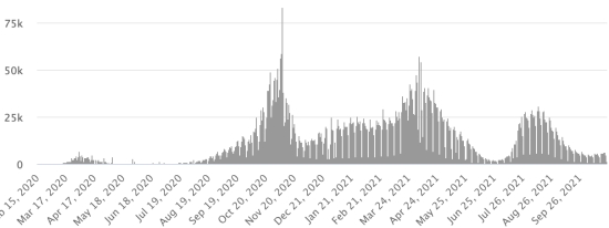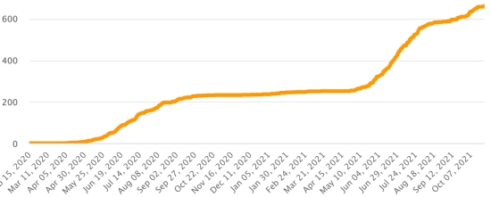 Le total de la 3ème vague (début 20 septembre 2021) s’élève à 2,036 cas confirmés (+213) et 52 décès (+4 en 4 jours). Mise à jour 19 octobre 2021.