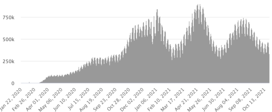 Vaccination : 414,3 millions de doses de vaccin injectées depuis le 14 décembre 2020 date de la première injection aux États-Unis (650,000 doses injectées, en 24h). Mise à jour 25 octobre 2021 (dernières données disponibles).