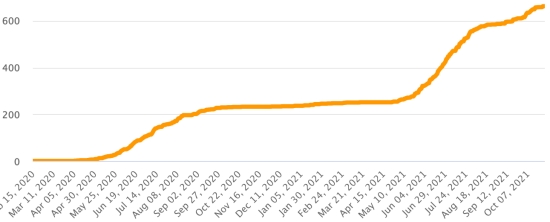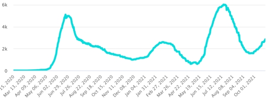 Le total de la 3ème vague (début 20 septembre 2021) s’élève à 2,240 cas confirmés (+213) et 52 décès (+0 en 24h). Mise à jour 22 octobre 2021.