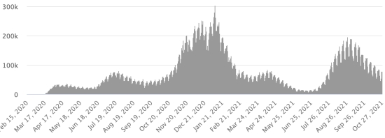 Vaccination : 416,15 millions de doses de vaccin injectées depuis le 14 décembre 2020 date de la première injection aux États-Unis (1,14 million de doses injectées, en 24h). Mise à jour 27 octobre 2021 (dernières données disponibles).