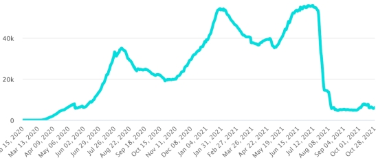 Vaccination : 6,97 millards de doses de vaccin injectées (+30 millions de doses injectées en 24h. Mise à jour 28 octobre 2021 (dernières données disponibles). HAÏTI : Situation épidémiologique : Avertissement : Le Ministère de la Santé Publique et de la Population (MSPP) n’as pas rendu disponible après le 22 octobre 2021 les données quotidiennes sur la situation du Covid-19 en Haïti. En conséquence, les données ci-dessous sur la situation en Haïti sont les dernières disponibles. Selon le Ministère de la Santé Publique, +50 nouveaux cas en 24h de Covid-19 et de ses variants auraient été confirmés en Haïti le 22 octobre 2021 (dernières données partielles disponibles) pour un total de 23,823 cas confirmés sur l’ensemble du territoire national (46.9% de femmes et 53.1% hommes), depuis le premier cas (19 mars 2020 https://www.haitilibre.com/article-30319-haiti-sante-origine-des-2-premiers-cas-de-covid-19-en-haiti.html ). Précédente mise à jour (+154 cas les 20 et 21 octobre). Guérisons : 20,286 (+20 en 24h) Taux de guérison : 85,15% (-) Décès : 662 décès +0 en 24h () Taux de mortalité : 2,77% (-) Haïti : Tendance des décès :