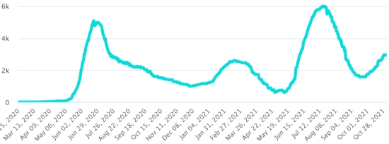 Vaccination : 7,13 millards de doses de vaccin injectées (+30 millions de doses injectées en 24h. Mise à jour 2 novembre 2021 (dernières données disponibles). HAÏTI : Situation épidémiologique : Selon le Ministère de la Santé Publique, +23 nouveaux cas en 24h de Covid-19 et de ses variants auraient été confirmés en Haïti les 27 octobre 2021 (dernières données partielles disponibles) pour un total de 24,004 cas confirmés sur l’ensemble du territoire national (47% de femmes et 53% hommes), depuis le premier cas (19 mars 2020 https://www.haitilibre.com/article-30319-haiti-sante-origine-des-2-premiers-cas-de-covid-19-en-haiti.html ). Précédente mise à jour (+21 cas le 26 octobre). Guérisons : 20,374 (+19 en 24h) Taux de guérison : 84,87% (=) Décès : 677 décès +2 en 24h (Ouest +1, Nippes+1) Taux de mortalité : 2,82% (+) Haïti : Tendance des décès :