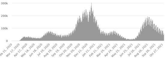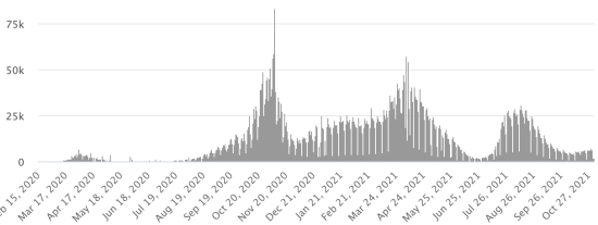 4ème vague : Le total de la 3ème vague (début 20 septembre 2021) s’élève à 2,421 cas confirmés (+21) et 67 décès (+4 en 24h). Mise à jour 27 octobre 2021. Cas testés depuis le début de la pandémie : 131,997 cas (+115 en 24h) mise à jour 26 octobre 2021 dernières données disponibles. Notez que le très faible nombre de personnes testées ne permet pas statistiquement de faire une estimation représentative des cas actifs de Covid-19 en Haïti. Ce qui explique également le faible nombre de cas détecté quotidiennement. À titre de comparaison la République voisine a réalisé plus de 2,2 millions de tests sur sa population depuis le début de l’épidémie. TOP 5 des Communes les plus touchées dans l’Ouest (2021) : Delmas : 2,382 (+3) ; Pétion ville 1,869 (+0) ; Port-au-Prince 1,297 (+0) ; Tabarre 1,040 (+2) ; Croix-des-Bouquets 1,026 (+0) Cas confirmés par département (2021) : Ouest : 8,848 cas (2020 : 6,945 cas) Nord : 615 cas (2020 : 677 cas) Centre : 836 cas (2020 : 508 cas) Artibonite : 720 cas (2020 : 593 cas) Nord-Est : 351 cas (2020 : 314 cas) Sud-Est : 541 cas (2020 : 274 cas) Sud : 654 cas (2020 : 262 cas) Nord-Ouest : 331cas (2020 : 229 cas) Grand'Anse : 768 cas (2020 : 176 cas) Nippes : 213 cas (2020 : 149 cas) Décès cumulés par département (2021) : Ouest : 222 décès (2020 : 104 décès) Nord : 48 décès (2020 : 34 décès) Centre : 34 décès (2020 : 13 décès) Artibonite : 29 décès (2020 : 39 décès) Nord-Est : 6 décès (2020 : 6 décès) Sud : 39 décès (2020 : 6 décès) Sud-Est : 12 décès (2020 : 9 décès) Nord-Ouest : 15 décès (2020 : 12 décès) Grand'Anse : 7 décès (2020 : 13 décès) Nippes : 24 décès (2020 : 5 décès) Répartition des décès par âge (depuis le début de l’épidémie) : 0-9 ans : 13 décès 10-19 ans : 6 décès 20-29 ans : 25 décès 30-39 ans : 43 décès 40-49 ans : 69 décès 50-59 ans : 111 décès 60-69 ans : 153 décès 70-79 ans : 152 décès (+1) 80 ans et plus : 105 décès (+1) Vaccination : 123,161 (+4,959 en 5 jours) doses de vaccin « Spikevax » (appellation officielle) du 20 octobre Laboratoire MODERNA ont été injectées au total en Haïti depuis le 16 juillet 2021, date de la première injection. 35,592 personnes sont entièrement vaccinées (2 doses). Mise à jour 25 octobre 2021, dernières données disponibles. Liste des 149 Centres de vaccination ouverts en Haïti (et horaires) par département : (mise à jour 20 octobre 2021) DIASPORA : Situation épidémiologique : USA : *Cas depuis le premier cas (9 mars 2020) : 46,999,771 cas (+68,487 en 24h), la veille (+107,346) *Guérisons : 37,009,990 guérisons (+128,154 en 24h), la veille (+166,523) Taux national de Guérison : 78,74% (+) *Décès : 768,847 décès (+1,411 en 24h), la veille (+1,137) Taux national de mortalité : 1,63% (=) *Cas actifs (moins décès et guérisons) : 9,220,934 cas (-61,078), la veille (-60,314) *Tests : 703,435,530 personnes testées depuis le premier cas USA : Nombre de cas confirmés quotidiens :