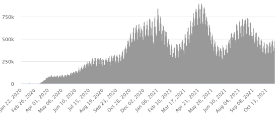 SITUATION MONDIALE : Situation épidémiologique : Jeudi 4 novembre 2021 le nombre de personnes contaminées dans le monde par le coronavirus Covid-19 depuis le début de la pandémie (Source officielle), s’élève à 248,920,917 cas (+590.488 en 24h), la veille (+428,084) Nombre de pays contaminés : 221 *Guérisons : 225,512,590 personnes ont été guéries du Covid-19 dans le monde (+488,722 en 24h), la veille (+428,978) *Décès : 5,039,455 personnes sont mortes du Covid-19 dans le monde (+9,719 en 24h), la veille (+8,186) *Cas actifs (moins décès et guérisons) dans le monde est actuellement de 18,368,872 cas (+92,047 en 24h), la veille (-9,080) Taux moyen de guérison au monde : 90,59% (+) Taux moyen de mortalité au monde : 2,02% (=) Monde : Nombre de cas confirmés quotidiens :