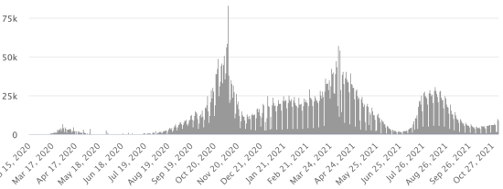4ème vague : Le total de la 3ème vague (début 20 septembre 2021) s’élève à 2,449 cas confirmés et 69 décès. Mise à jour 28 octobre 2021. Cas testés depuis le début de la pandémie : 132,422 cas (+425 en 24h) dernières données disponibles. Notez que le très faible nombre de personnes testées ne permet pas statistiquement de faire une estimation représentative des cas actifs de Covid-19 en Haïti. Ce qui explique également le faible nombre de cas détecté quotidiennement. À titre de comparaison la République voisine a réalisé plus de 2,2 millions de tests sur sa population depuis le début de l’épidémie. TOP 5 des Communes les plus touchées dans l’Ouest (2021) : Delmas : 2,391 (+9) ; Pétion ville 1,872 (+3) ; Port-au-Prince 1,298 (+2) ; Tabarre 1,043 (+3) ; Croix-des-Bouquets 1,027 (+1) Cas confirmés par département (2021) : Ouest : 8,867 cas (2020 : 6,945 cas) Nord : 615 cas (2020 : 677 cas) Centre : 836 cas (2020 : 508 cas) Artibonite : 720 cas (2020 : 593 cas) Nord-Est : 351 cas (2020 : 314 cas) Sud-Est : 543 cas (2020 : 274 cas) Sud : 658 cas (2020 : 262 cas) Nord-Ouest : 331 cas (2020 : 229 cas) Grand'Anse : 771 cas (2020 : 176 cas) Nippes : 213 cas (2020 : 149 cas) Décès cumulés par département (2021) : Ouest : 222 décès (2020 : 104 décès) Nord : 48 décès (2020 : 34 décès) Centre : 34 décès (2020 : 13 décès) Artibonite : 29 décès (2020 : 39 décès) Nord-Est : 6 décès (2020 : 6 décès) Sud : 41 décès (2020 : 6 décès) Sud-Est : 12 décès (2020 : 9 décès) Nord-Ouest : 15 décès (2020 : 12 décès) Grand'Anse : 7 décès (2020 : 13 décès) Nippes : 24 décès (2020 : 5 décès) Répartition des décès par âge (depuis le début de l’épidémie) : 0-9 ans : 13 décès 10-19 ans : 6 décès 20-29 ans : 25 décès 30-39 ans : 43 décès 40-49 ans : 69 décès 50-59 ans : 112 décès(+1) 60-69 ans : 153 décès 70-79 ans : 153 décès (+1) 80 ans et plus : 105 décès Vaccination : 135,256 (+12,095 en 6 jours) doses de vaccin « Spikevax » (appellation officielle) du 20 octobre Laboratoire MODERNA ont été injectées au total en Haïti depuis le 16 juillet 2021, date de la première injection. 39,676 personnes sont entièrement vaccinées (2 doses). Mise à jour 31 octobre 2021, dernières données disponibles. Liste des 149 Centres de vaccination ouverts en Haïti (et horaires) par département : (mise à jour 20 octobre 2021) DIASPORA : Situation épidémiologique : USA : *Cas depuis le premier cas (9 mars 2020) : 47,187,256 cas (+81,788 en 24h), la veille (+105,697) *Guérisons : 37,194,111 guérisons (+77,507 en 24h), la veille (+106,614) Taux national de Guérison : 78,82% (+) *Décès : 772,315 décès (+1,461 en 24h), la veille (+2,007) Taux national de mortalité : 1,63% (=) *Cas actifs (moins décès et guérisons) : 9,220,830 cas (+2,820), la veille (-2,924) *Tests : 706,743,401 personnes testées depuis le premier cas USA : Nombre de cas confirmés quotidiens :