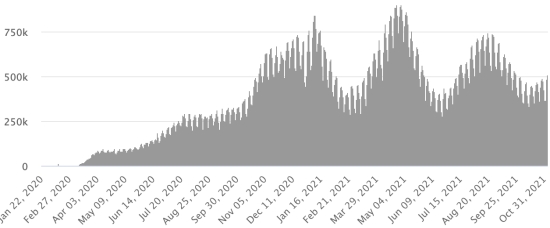 SITUATION MONDIALE : Situation épidémiologique : Vendredi 5 novembre 2021 le nombre de personnes contaminées dans le monde par le coronavirus Covid-19 depuis le début de la pandémie (Source officielle), s’élève à 249,395,694 cas (+474,777 en 24h), la veille (+590,488) Nombre de pays contaminés : 221 *Guérisons : 225,872,079 personnes ont été guéries du Covid-19 dans le monde (+359,489 en 24h), la veille (+488,722) *Décès : 5,046,071 personnes sont mortes du Covid-19 dans le monde (+6,616 en 24h), la veille (+9,719) *Cas actifs (moins décès et guérisons) dans le monde est actuellement de 18,477,544 cas (+108,672 en 24h), la veille (+92,047) Taux moyen de guérison au monde : 90,56% (-) Taux moyen de mortalité au monde : 2,02% (=) Monde : Nombre de cas confirmés quotidiens :