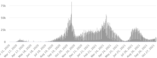 SITUATION MONDIALE : Situation épidémiologique : Samedi 6 novembre 2021 le nombre de personnes contaminées dans le monde par le coronavirus Covid-19 depuis le début de la pandémie (Source officielle), s’élève à 249,900,405 cas (+504,711 en 24h), la veille (+474,777) Nombre de pays contaminés : 221 *Guérisons : 226,241,264 personnes ont été guéries du Covid-19 dans le monde (+369,185 en 24h), la veille (+359,489) *Décès : 5,054,885 personnes sont mortes du Covid-19 dans le monde (+8,814 en 24h), la veille (+6,616) *Cas actifs (moins décès et guérisons) dans le monde est actuellement de 18,604,256 cas (+126,712 en 24h), la veille (+108,672) Taux moyen de guérison au monde : 90,53% (-) Taux moyen de mortalité au monde : 2,02% (=) Monde : Nombre de cas confirmés quotidiens :