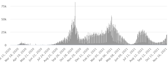 Vaccination : 446,25 millions de doses de vaccin injectées depuis le 14 décembre 2020 date de la première injection aux États-Unis (1,46 millions de doses injectées en 24h). Mise à jour 18 novembre 2021 (dernières données disponibles).