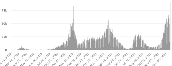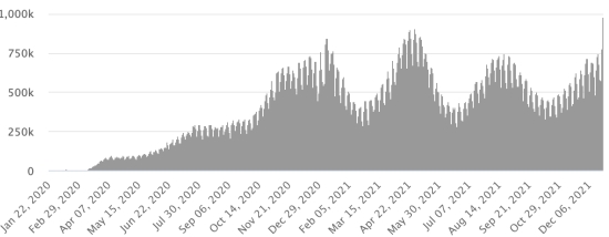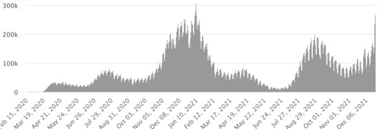 *Cas depuis le premier cas (29 février 2020) : 52,788,451 cas (+277,473 en 24h), la veille (+257,130) *Guérisons : 40,964,993 guérisons (+56,847 en 24h), la veille (+106,914) Taux national de Guérison : 77,60% (-) *Décès : 834,455 décès (+1,426 en 24h), la veille (+2,039) Taux national de mortalité : 1,58% (=) *Cas actifs (moins décès et guérisons) : 10,989,003 cas (+219,200 en 24h), la veille (+148,177) Test : 797,357,949 dernière donnée disponible. USA : Nombre de cas confirmés quotidiens