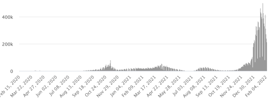 SITUATION MONDIALE 2019-2022 : Situation épidémiologique : Lundi 7 février 2022 le nombre de personnes contaminées dans le monde par le coronavirus Covid-19 et ses variants depuis le début de la pandémie (11 mars 2020) s’élève à 396,254,535 cas (+1,846,612 en 24h), la veille (+2,727,767) Nombre de pays contaminés : 221 *Guérisons : 315,077,095 personnes ont été guéries du Covid-19 dans le monde (+1,885,078 en 24h), la veille (+2,639,643) *Décès : 5,759,785 personnes sont mortes du Covid-19 dans le monde (+5,882 en 24h), la veille (+9,212) *Cas actifs (moins décès et guérisons) dans le monde est actuellement de 75,417,655 cas (-44,348 en 24h), la veille (+78,912) Taux moyen de guérison au monde : 79,51% (+) Taux moyen de mortalité au monde : 1,45% (=) Monde : Nombre de cas confirmés quotidiens :