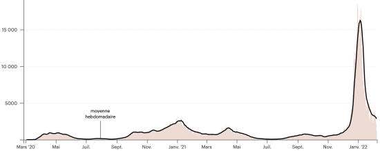 Test : 16,306,071 personnes testées depuis le premier cas (+73,805 en 72h) Vaccination : 17,992,280 doses de vaccin injectées depuis le 14 décembre 2020 date de la première injection (+108,490 doses en 72h), dernières données disponibles - MSSS en date du 7 février 2022) FRANCE : *Cas confirmés depuis le premier cas (24 janvier 2020) : 20,804,372 cas (+ 46,001 cas en 24h), la veille (155,439) *Guérisons : 14,606,791 guérisons (+464,640 en 24h), précédent (+101,845) Taux national de Guérison : 70,21% (-) Décès : 132,923 décès (+417 en 24h), la veille (+129) Taux de mortalité : 0,63% (=) Cas Actifs : 6,064,658 (-419,185 en 24h), la veille (-53,465) Test : 231,648,947 (dernière donnée disponible 30 janvier 2022) France : Nombre de cas confirmés quotidiens