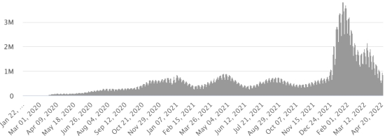 Vaccination : 571,45 millions de doses de vaccin injectées depuis le 14 décembre 2020 date de la première injection aux États-Unis (280,000). Mise à jour 23 avril (dernières données disponibles).