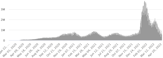 (Jour-1) Vaccination : 11,60 millards de doses de vaccin injectées (+10 millions de doses injectées. Mise à jour 24 avril 2022 (dernières données disponibles). HAÏTI : Avertissement : Le Ministère de la Santé Publique et de la Population (MSPP) n’as pas rendu disponible après le 15 avril 2022 les données quotidiennes sur la situation du Covid-19 en Haïti. En conséquence, les données ci-dessous sur la situation en Haïti sont les dernières disponibles. Selon le Ministère de la Santé Publique, +30 nouveaux cas de Covid-19 et de ses variants auraient été confirmés en Haïti en date du 15 avril 2022 (dernières données partielles disponibles) pour un total de 30,640 cas confirmés sur l’ensemble du territoire national (48,7% de femmes et 51,3% hommes), depuis le premier cas (19 mars 2020 https://www.haitilibre.com/article-30319-haiti-sante-origine-des-2-premiers-cas-de-covid-19-en-haiti.html ). Précédente mise à jour (+5 cas en date du 13 avril 2022). Guérisons : 29,389 (+77) Taux de guérison : 95,91% (+) Décès : 835 décès (+0) Taux de mortalité : 2,72% (=) 5ème vague (Omicron dominant) : Total de la 5ème vague (début 27 décembre 2021) 4,651 cas confirmés et 69 décès Dépistage depuis le début de la pandémie : 194,452 tests (+659 en 48h depuis le 19 mars 2020, dernières données disponibles. Notez que la très petite quantité de personnes dépistées chaque jour à l’échelon national sur une population estimé à 11,6 millions de citoyens, ne permet pas statistiquement de faire une estimation représentative et objective de la situation en Haïti, ce qui se traduit par un nombre de cas confirmés quotidiennement largement sous-évalué de l’avis des observateurs spécialistes. TOP 5 des Communes les plus touchées dans l’Ouest (2022) : Delmas : 746 (+0) ; Pétion-ville 625 (+0) ; Port-au-Prince 407 (+0) ; Tabarre 288 (+0) ; Croix-des-Bouquets 243 (+1) Cas confirmés par département (2022 / 2021 / 2020) : Ouest : 2022 : 2,570 cas ; (2021 : 9,890) ; (2020 : 6,945 cas) Nord : 2022 : 281 cas ; (2021 : 664) ; (2020 : 677 cas) Centre : 2022 : 241 cas ; (2021 : 1,001) ; (2020 : 508 cas) Artibonite : 2022 : 190 cas ; (2021 : 855) ; (2020 : 593 cas) Nord-Est : 2022 : 153 cas ; (2021 : 404) ; (2020 : 314 cas) Sud-Est : 2022 : 282 cas ; (2021 : 768) ; (2020 : 274 cas) Sud : 2022 : 216 cas ; (2021 : 891) ; (2020 : 262 cas) Nord-Ouest : 2022 : 266 cas ; (2021 : 383) ; (2020 : 229 cas) Grand'Anse : 2022 : 177 cas ; (2021 : 861) ; (2020 : 176 cas) Nippes : 2022 : 39 cas ; (2021 : 249) (2020 : 149 cas) Décès cumulés par département (2022-2021) : Ouest : 296 décès (2020 : 104 décès) Nord : 54 décès (2020 : 34 décès) Centre : 79 décès (2020 : 13 décès) Artibonite : 42 décès (2020 : 39 décès) Nord-Est : 7 décès (2020 : 6 décès) Sud : 51 décès (2020 : 6 décès) Sud-Est : 15 décès (2020 : 9 décès) Nord-Ouest : 15 décès (2020 : 12 décès) Grand'Anse : 7 décès (2020 : 13 décès) Nippes : 27 décès (2020 : 5 décès) Répartition des décès par âge (depuis le début de l’épidémie) : 0-9 ans : 15 décès 10-19 ans : 10 décès 20-29 ans : 31 décès 30-39 ans : 56 décès 40-49 ans : 80 décès 50-59 ans : 135 décès 60-69 ans : 187 décès 70-79 ans : 184 décès 80 ans et plus : 137 décès Vaccination : 174,804 haïtiens (1,5% de la population) +6,913 en 2 jours ont reçu une 1ère dose de vaccin depuis le 16 juillet 2021 date de la première injection à travers 149 centres de vaccinations ouverts et 120,967 haïtiens sont entièrement vaccinés (2 doses, 1.0% de la population) +5,547 en 2 jours jours. Mise à jour 17 avril 2022 dernières informations disponibles (source MSPP). Liste des 149 Centres de vaccination ouverts en Haïti (et horaires) par département : (mise à jour 20 octobre 2021, dernières informations disponibles) DIASPORA : Situation épidémiologique : USA : *Cas depuis le premier cas (29 février 2020) : 82,662,748 cas (+12,969 en 24h), la veille (+21,690) *Guérisons : 80,465,351 guérisons (+30,426 en 24h), la veille (+32,524) Taux national de Guérison : 97,34% (+) *Décès : 1,018,335 décès (+19 en 24h), la veille (+545) Taux national de mortalité : 1,23% (=) *Cas actifs (moins décès et guérisons) : 1,179,062 (-17,476 en 24h), la veille (-10,996) USA : Nombre de cas confirmés quotidiens :
