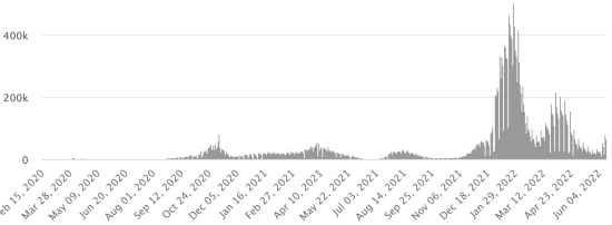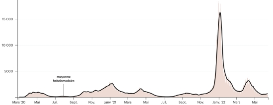 Vaccination : 11,98 millards de doses de vaccin injectées (+80 millions). (Dernières données disponibles). HAÏTI : Avertissement : Le Ministère de la Santé Publique et de la Population (MSPP) n’as pas rendu disponible après le 9 juin 2022 les données quotidiennes sur la situation du Covid-19 en Haïti. En conséquence, les données ci-dessous sur la situation en Haïti sont les dernières disponibles. Selon le Ministère de la Santé Publique, +50 nouveaux cas de Covid-19 et de ses variants auraient été confirmés en Haïti en date du 9 juin 2022 (dernières données partielles disponibles) pour un total de 31,054 cas confirmés sur l’ensemble du territoire national (48,7% de femmes et 51,3% hommes), depuis le premier cas (19 mars 2020 https://www.haitilibre.com/article-30319-haiti-sante-origine-des-2-premiers-cas-de-covid-19-en-haiti.html ). Précédente mise à jour (+41 cas en date du 6 juin 2022). Guérisons : 29,752 (+2) Taux de guérison : 95,80% (-) Décès : 837 décès (+0) Taux de mortalité : 2,69% (=) Dépistage depuis le début de la pandémie : 204,962 tests depuis le 19 mars 2020 (+594 en 3 jours) un nombre de tests insuffisant statistiquement pour être représentatif de la situation sanitaire, ce qui se traduit par un nombre de cas confirmés quotidiennement largement sous-évalué de l’avis des spécialistes de la santé. TOP 5 des Communes les plus touchées dans l’Ouest (2022) : Delmas : 801 (+6) ; Pétion-ville 646 (+7) ; Port-au-Prince 431 (+2) ; Tabarre 328 (+8) ; Croix-des-Bouquets 264 (+4) Cas confirmés par département (2022 / 2021 / 2020) : Ouest : 2022 : 2,748 (+) cas ; (2021 : 9,890) ; (2020 : 6,945 cas) Nord : 2022 : 296 (+) cas ; (2021 : 664) ; (2020 : 677 cas) Centre : 2022 : 291 (=) cas ; (2021 : 1,001) ; (2020 : 508 cas) Artibonite : 2022 : 194 (=) cas ; (2021 : 855) ; (2020 : 593 cas) Nord-Est : 2022 : 172 (+) cas ; (2021 : 404) ; (2020 : 314 cas) Sud-Est : 2022 : 321 (+) cas ; (2021 : 768) ; (2020 : 274 cas) Sud : 2022 : 220 (+) cas ; (2021 : 891) ; (2020 : 262 cas) Nord-Ouest : 2022 : 286 (+) cas ; (2021 : 383) ; (2020 : 229 cas) Grand'Anse : 2022 : 222 (+) cas ; (2021 : 861) ; (2020 : 176 cas) Nippes : 2022 : 79 (+) cas ; (2021 : 249) (2020 : 149 cas) Décès cumulés par département (2022-2021) : Ouest : 298 décès (2020 : 104 décès) Nord : 54 décès (2020 : 34 décès) Centre : 79 décès (2020 : 13 décès) Artibonite : 42 décès (2020 : 39 décès) Nord-Est : 7 décès (2020 : 6 décès) Sud : 51 décès (2020 : 6 décès) Sud-Est : 15 décès (2020 : 9 décès) Nord-Ouest : 15 décès (2020 : 12 décès) Grand'Anse : 7 décès (2020 : 13 décès) Nippes : 27 décès (2020 : 5 décès) Répartition des décès par âge (depuis le début de l’épidémie) : 0-9 ans : 15 décès 10-19 ans : 10 décès 20-29 ans : 31 décès 30-39 ans : 56 décès 40-49 ans : 80 décès 50-59 ans : 135 décès 60-69 ans : 188 décès (+1) 70-79 ans : 184 décès 80 ans et plus : 138 décès (+1) Vaccination : 188,584 haïtiens (1,62% de la population) +3,615 en 13 jours ont reçu une 1ère dose de vaccin depuis le 16 juillet 2021 date de la première injection à travers 149 centres de vaccinations ouverts et 132,177 haïtiens sont entièrement vaccinés (2 doses, 1,13% de la population) +2,513 en 13 jours. Mise à jour 7 juin 2022 dernières informations disponibles (source MSPP). Liste des 149 Centres de vaccination ouverts en Haïti (et horaires) par département : (mise à jour 20 octobre 2021, dernières informations disponibles) DIASPORA : Situation épidémiologique : USA : *Cas depuis le premier cas (29 février 2020) : 87,549,563 cas (+124,717 en 24h), la veille (+103,143) *Guérisons : 83,339,680 guérisons (+93,882 en 24h), la veille (+86,006) Taux national de Guérison : 95,19% (-) Décès : 1,036,483 (+399 en 24h), la veille (+237) Taux de mortalité : 1,18% (=) *Cas actifs (moins décès et guérisons) : 3,173,400 (+30,436 en 24h), la veille -16,900) USA : Nombre de cas confirmés quotidiens :