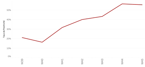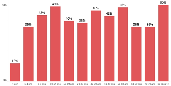 Répartition et écarts des cas suspects depuis le 3 octobre (en 24h) : Moins d’1 an : +168 (+6) 1-4 ans : 1,518 cas (+25) 5-9 ans : 1,100 cas (+24) 10-14 ans : 504 cas (+18) 15-19 ans : 371 cas (+7) 20-29 ans : 1,242 cas (+20) 30-39 ans : 1,230 cas (+15) 40-49 ans : 830 cas (+13) 50-59 ans : 559 cas (+14) 60-69 ans : 339 cas (+9) 70-79 ans : 156 cas (+1) 80 et + () cas () Hommes : 59,89% d’hommes (-); femmes 40,11% (+) Taux de positivité par segment d’âge :